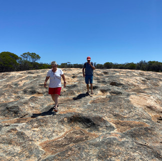 Mein gescheites App zeigt nach ein paar Hundertkilometer eine Sehenswürdigkeit am Strassenrand an. Ideal, um uns die Beine zu «vertrampen». Ein paar Hundert Meter hinter dem Parkplatz wölbt sich ein flacher Fels aus dem Boden. Die Erosion hat ein paar kleine Wasserlöcher hervorgebracht, ähnliche wie wir sie bereits im Kakadu Nationalpark gesehen haben. Auch hier haben die Aborigines die Löcher zur Regenwassersammlung verwendet. Der Fels ist von vielen gelben Wildblumen umrahmt und nach dem Regen klart der Himmel auf und zeigt sich tiefblau mit ein paar weissen Wolkenstreifen.